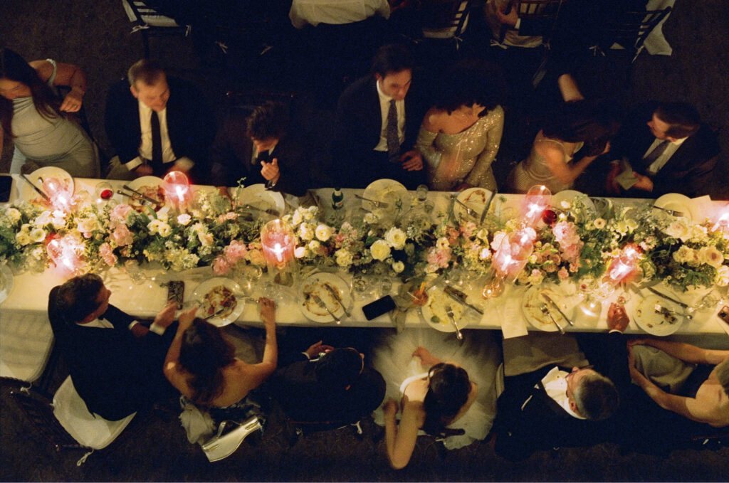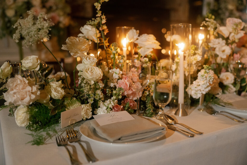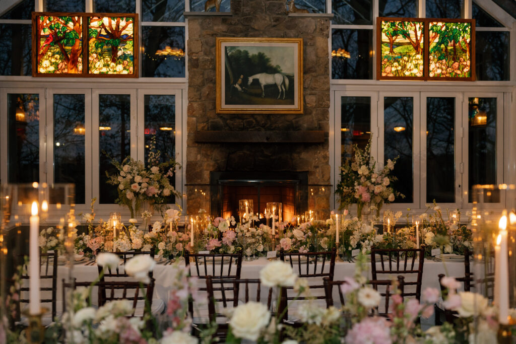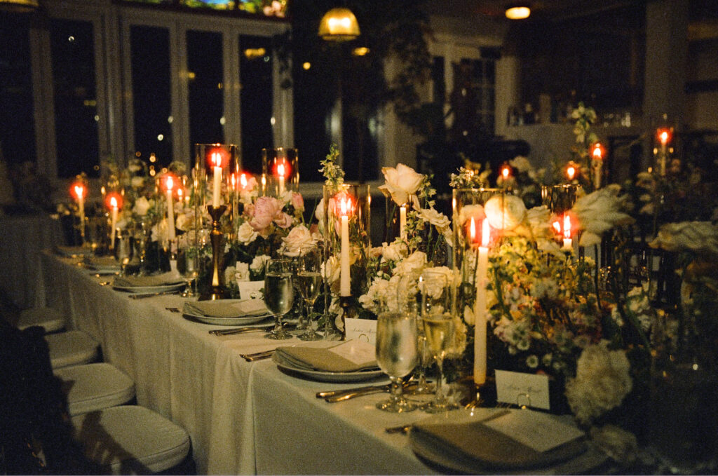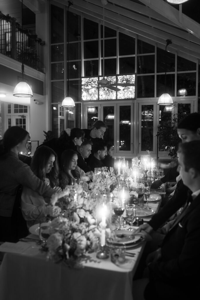 The evening transitioned into an intimate dinner reception inside the Carriage House, and this is where the night truly glowed. Candlelight filled the space – long tables illuminated by warm, flickering light that reflected off glassware and florals, creating a romantic, almost cinematic feel. It was the kind of dinner where conversations linger, laughter echoes softly, and time seems to slow down. The candles, the closeness of the guest count, and the warmth of the space made it the undeniable highlight of the evening.