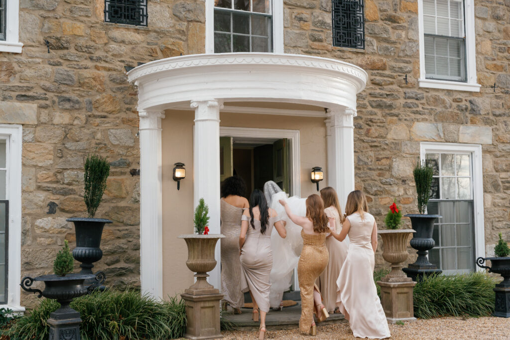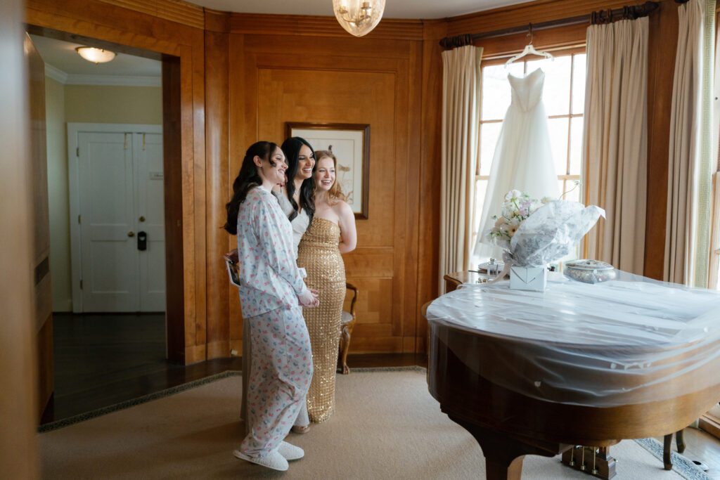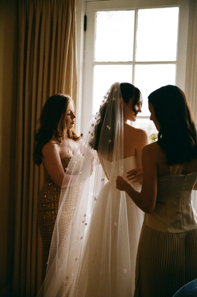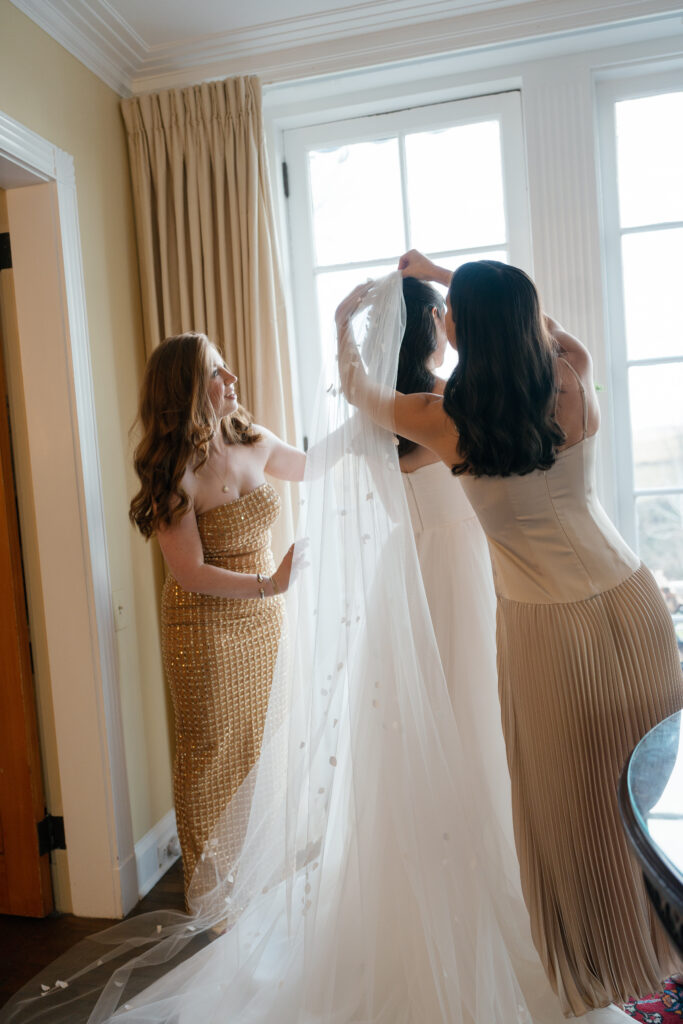 The morning unfolded slowly inside the Manor House, where the bride got ready surrounded by close friends and family. Natural light poured through the windows as final touches came together—an atmosphere that felt calm, editorial, and unhurried.