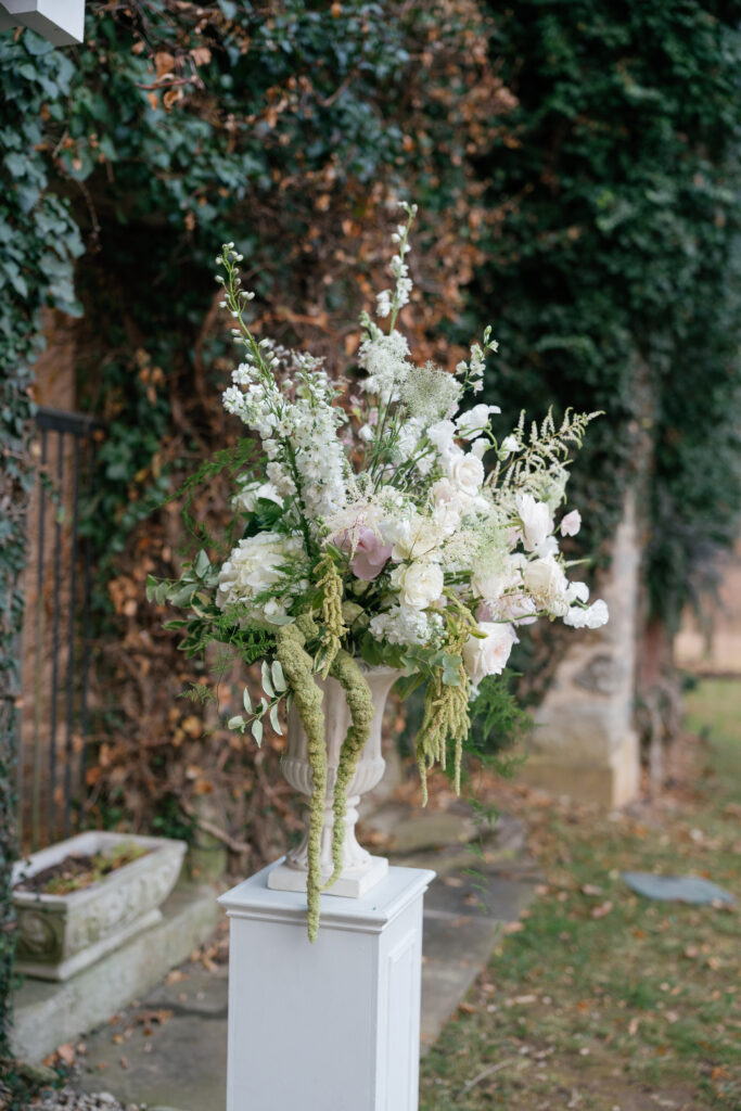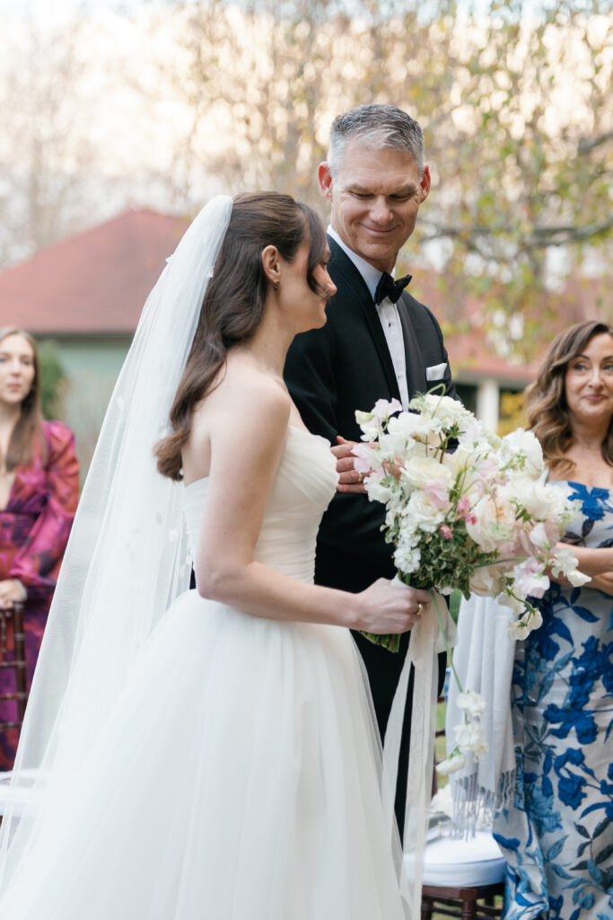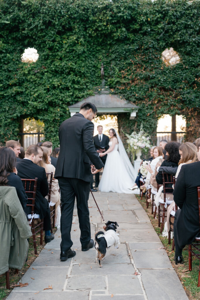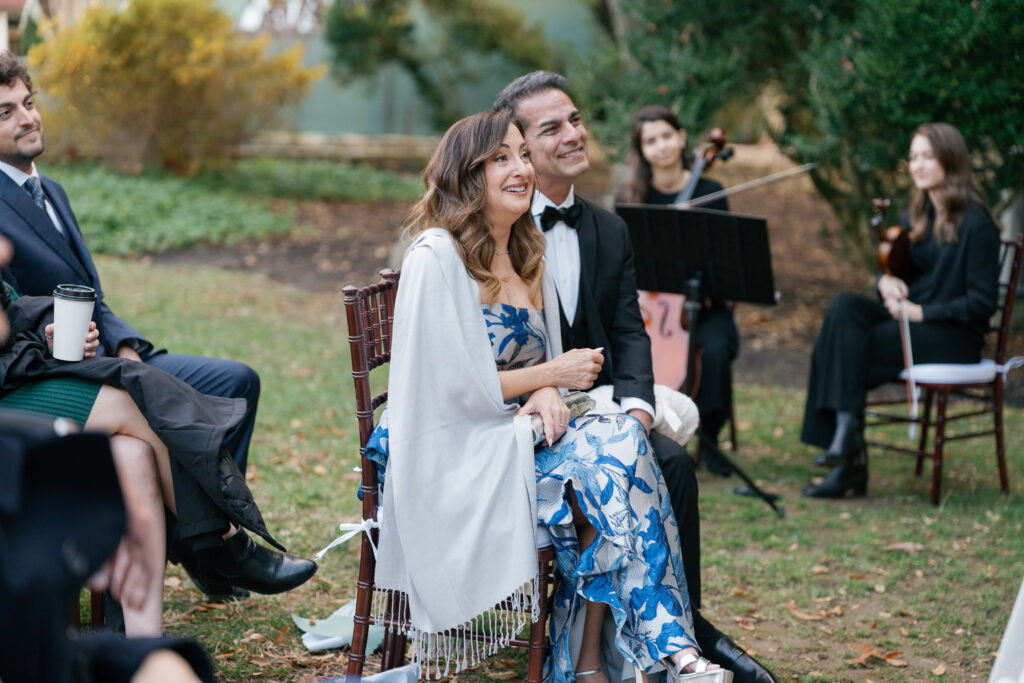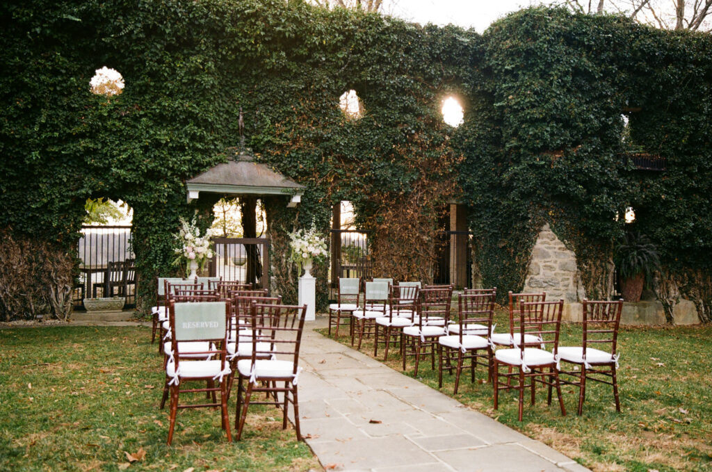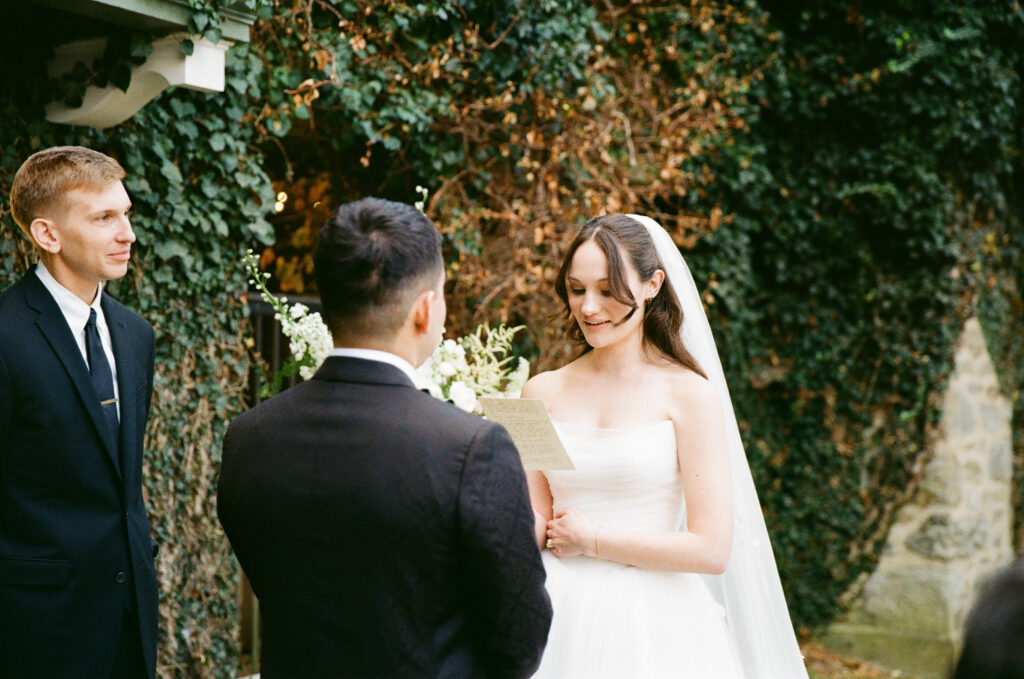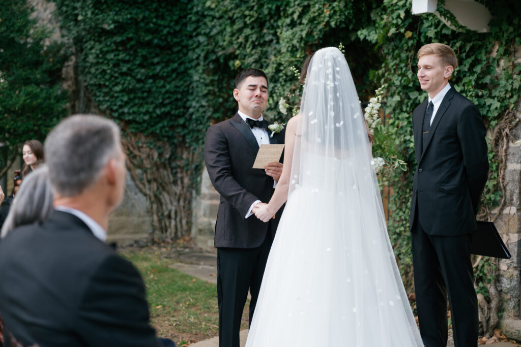 As guests gathered for the ceremony, Goodstone’s grounds felt cozy despite the crisp November air. To keep everyone warm, the couple served hot bourbon-infused apple cider, a small but thoughtful detail that perfectly matched the season. With soft string music floating through the air and the estate’s historic stone architecture as a backdrop, the ceremony felt heartfelt and quietly emotional—one of those moments where everything else fades away.